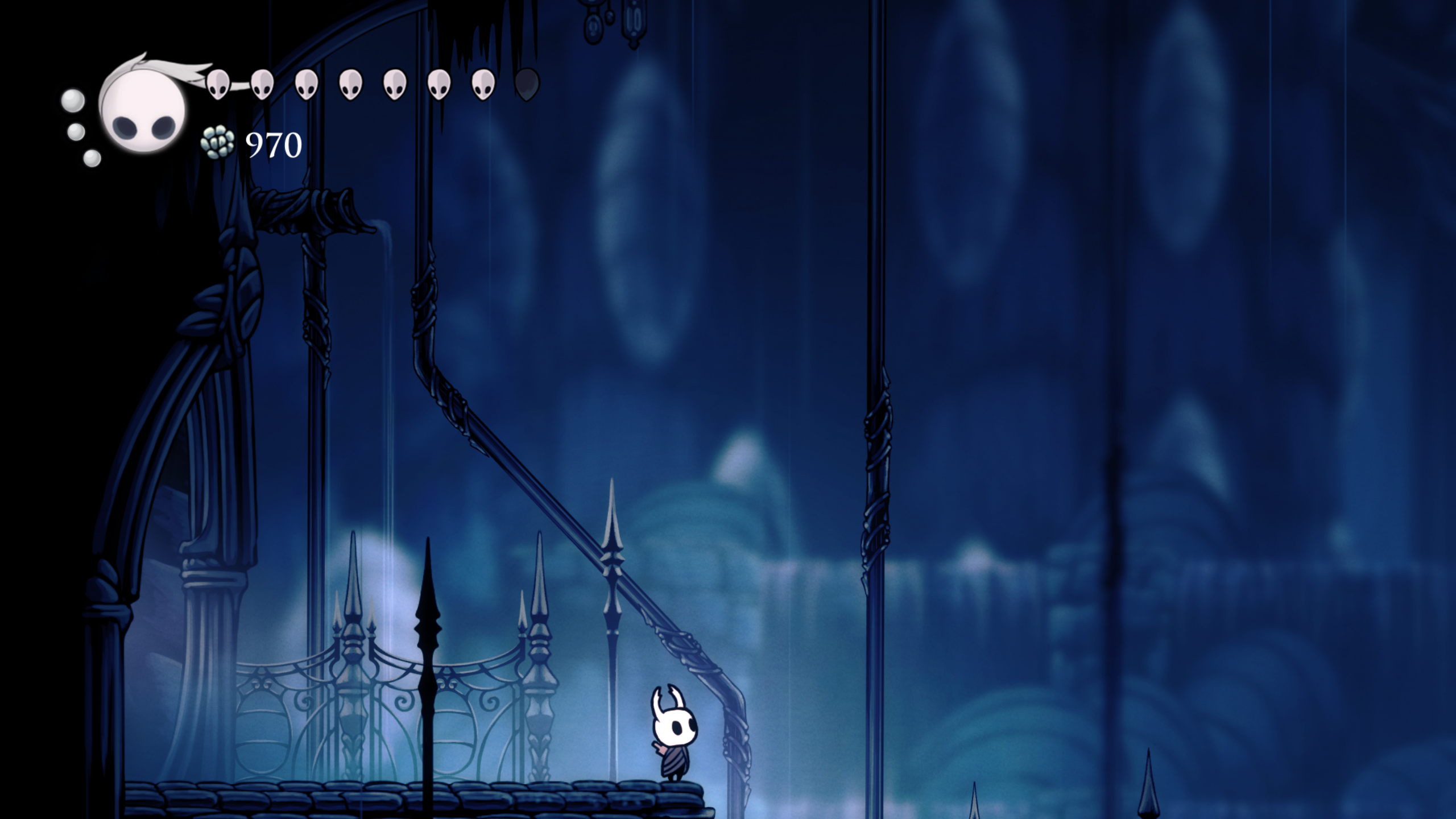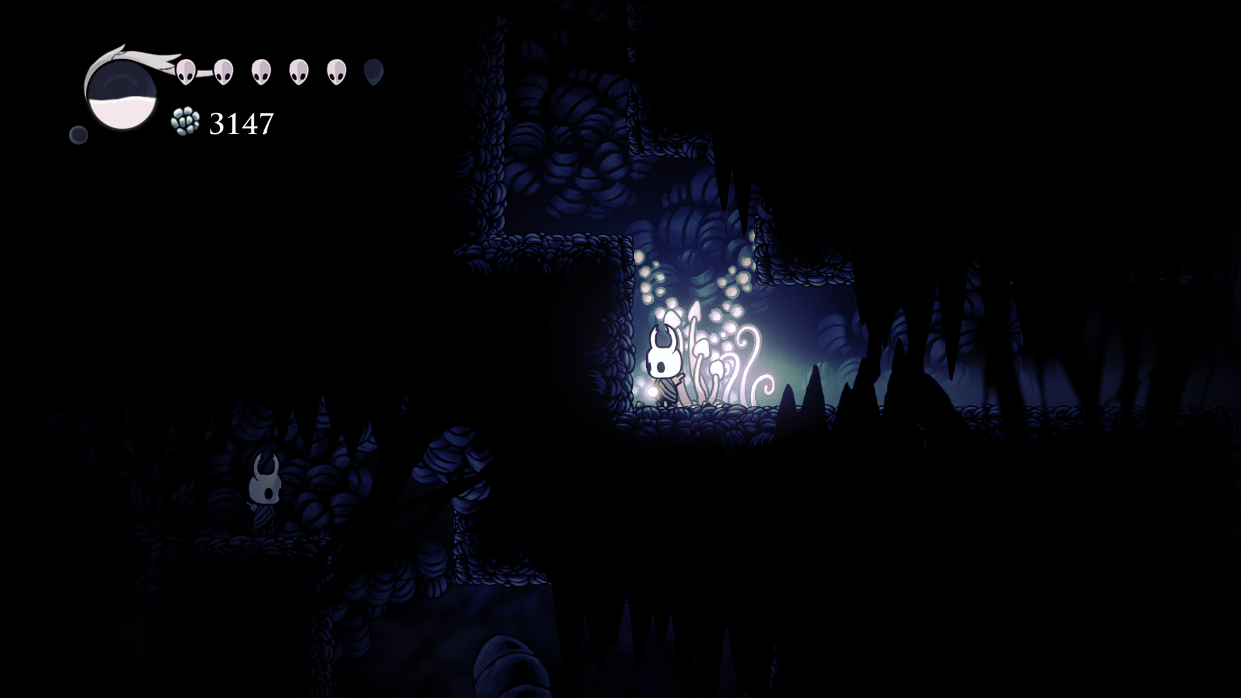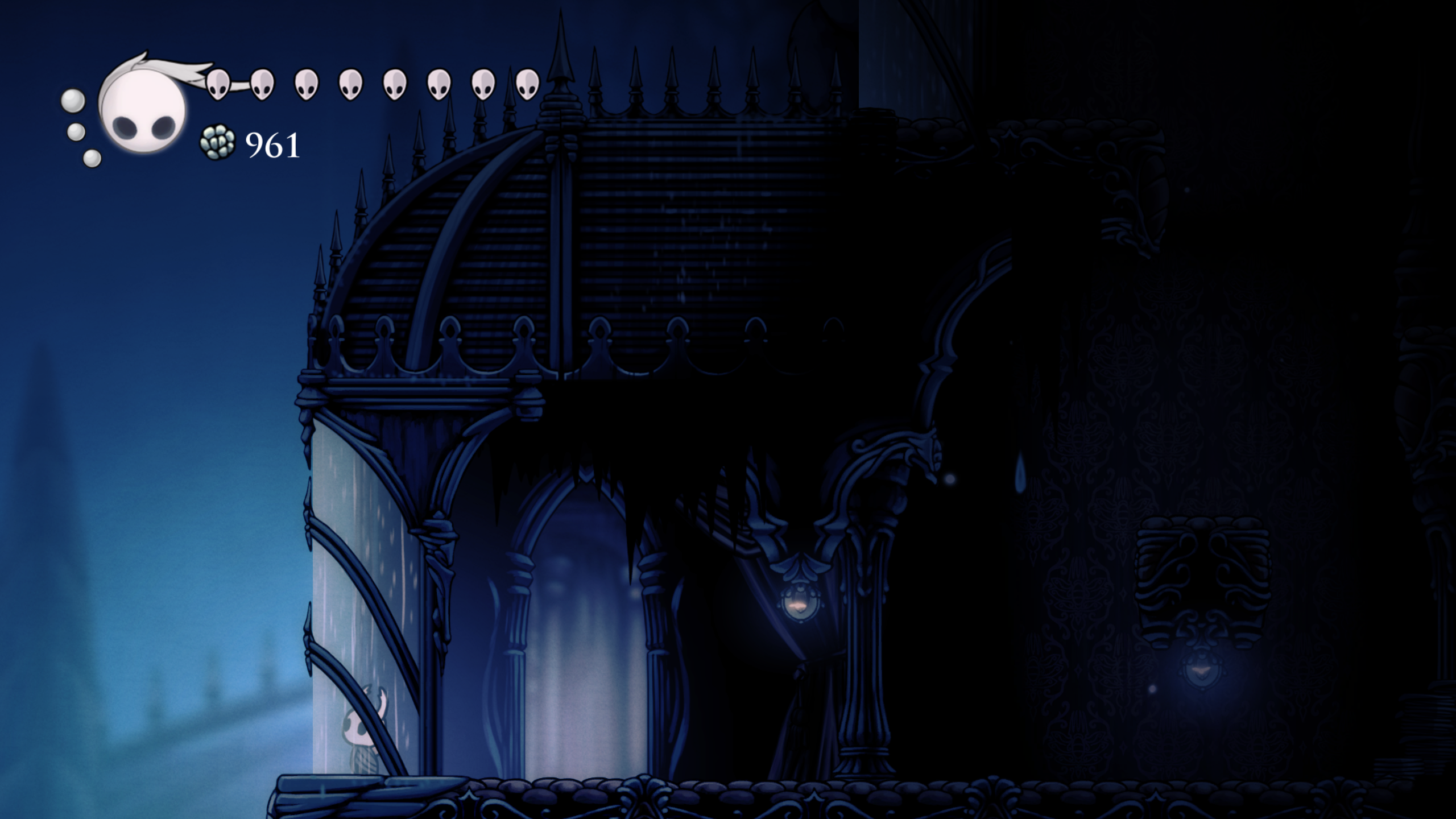 Durante los primeros momentos del juego se siente muy vacío pues comienzas, como todo metroidvania, sin muchas habilidades ni movimientos y en una zona muy “pequeña” sin mucha cosa, pocos enemigos y hasta la zona no es la mas vistosa, los tonos fríos y la ambientación oscura pueden no llamar tanto la atención, pero en este juego donde la exploración lo es todo, tu sentido de curiosidad de ve recompensado en casi todas las instancias. Entre mas quieras explorar el mundo, más contenido vas a encontrar y mejor te la vas a pasar, el mundo no te obliga a explorar todo, pero si te cautiva y el loop de explorar y encontrar ya sea un un nuevo charm o un fragmento de máscara es lo que terminó haciéndome querer explorar cada rincon de este mundo que Team Cherry creó.