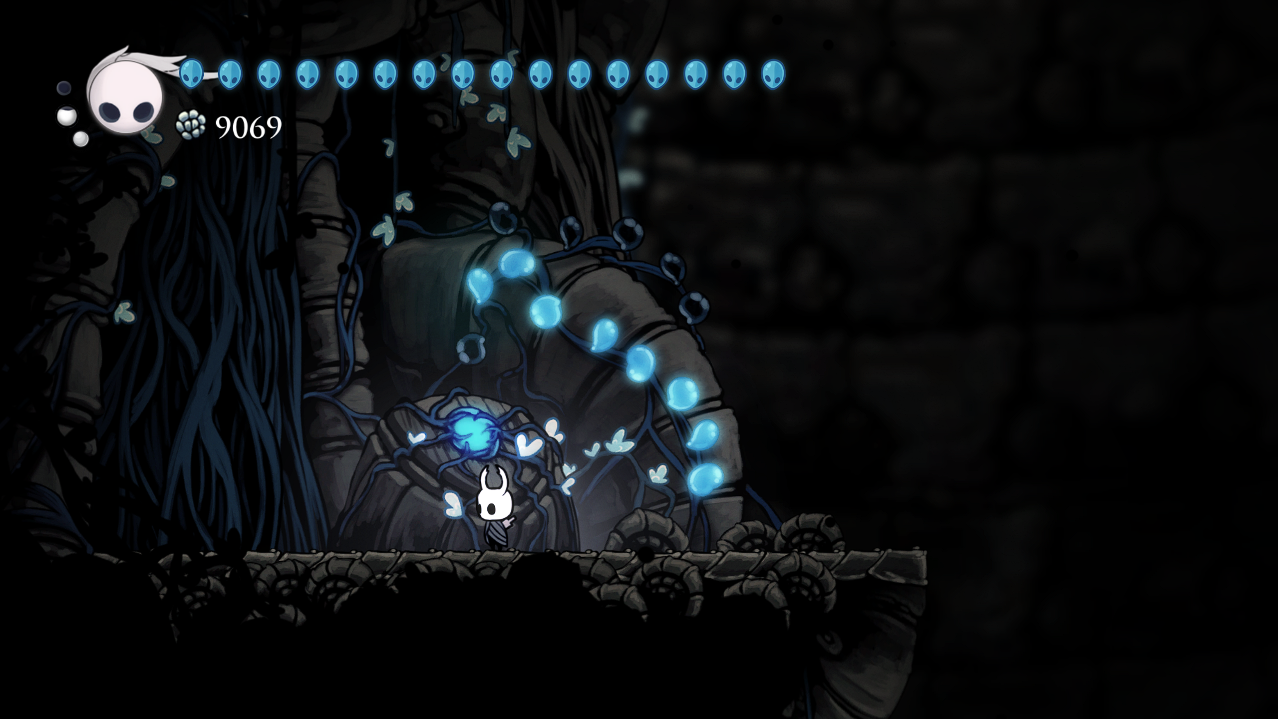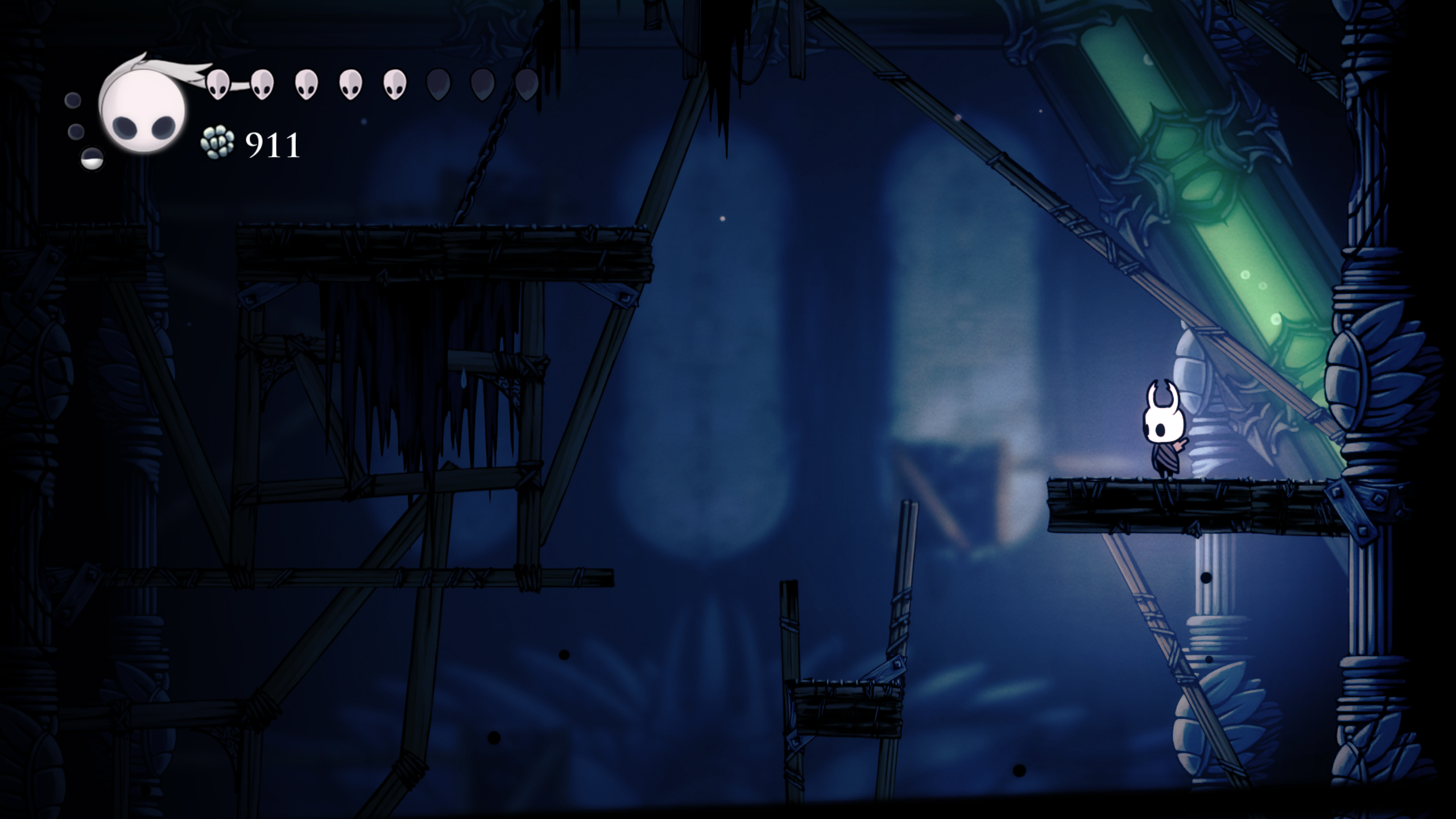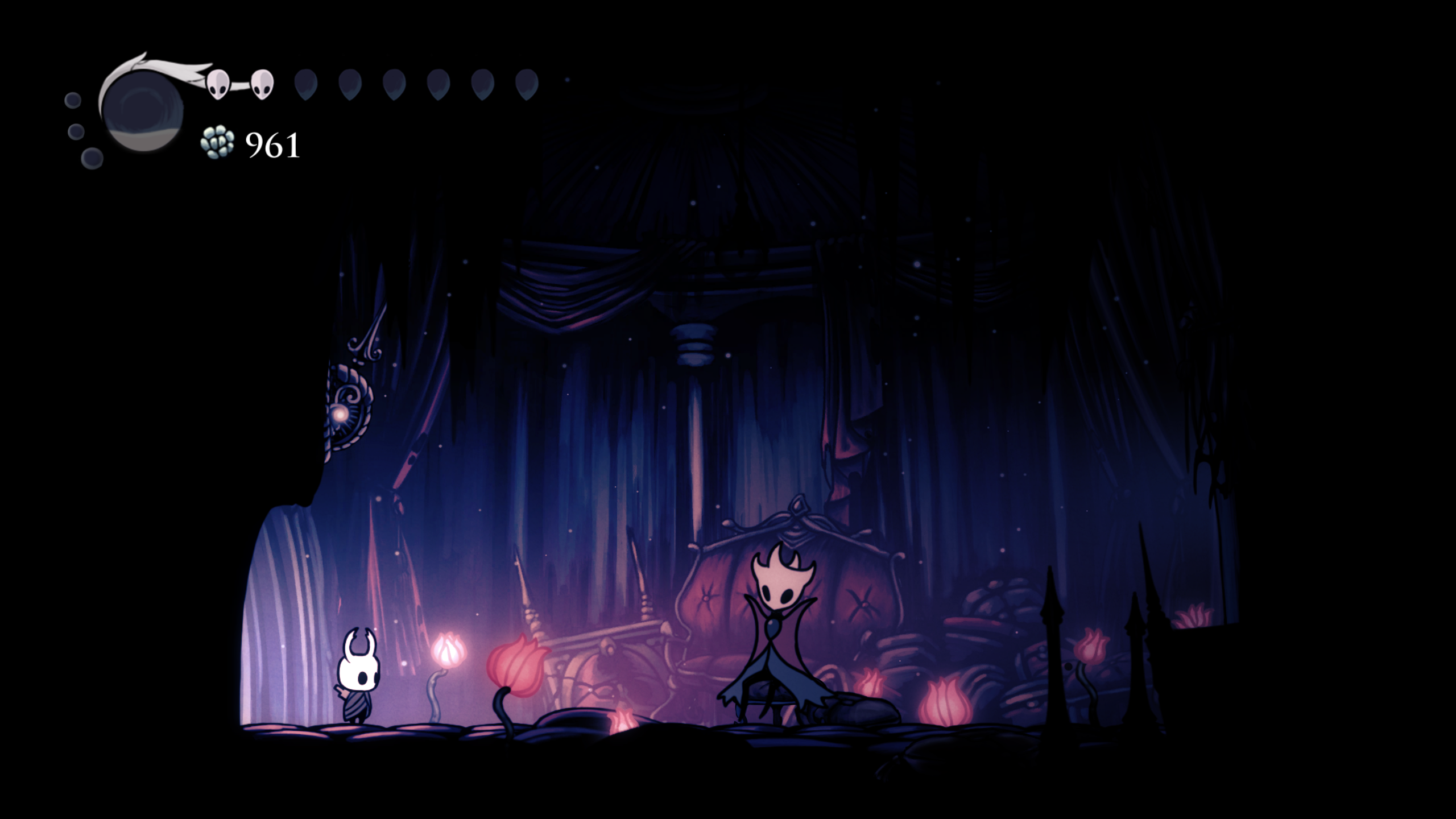 Durante los primeros momentos del juego se siente muy vacío pues comienzas, como todo metroidvania, sin muchas habilidades ni movimientos y en una zona muy “pequeña” sin mucha cosa, pocos enemigos y hasta la zona no es la mas vistosa, los tonos fríos y la ambientación oscura pueden no llamar tanto la atención, pero en este juego donde la exploración lo es todo, tu sentido de curiosidad de ve recompensado en casi todas las instancias. Entre mas quieras explorar el mundo, más contenido vas a encontrar y mejor te la vas a pasar, el mundo no te obliga a explorar todo, pero si te cautiva y el loop de explorar y encontrar ya sea un un nuevo charm o un fragmento de máscara es lo que terminó haciéndome querer explorar cada rincon de este mundo que Team Cherry creó.