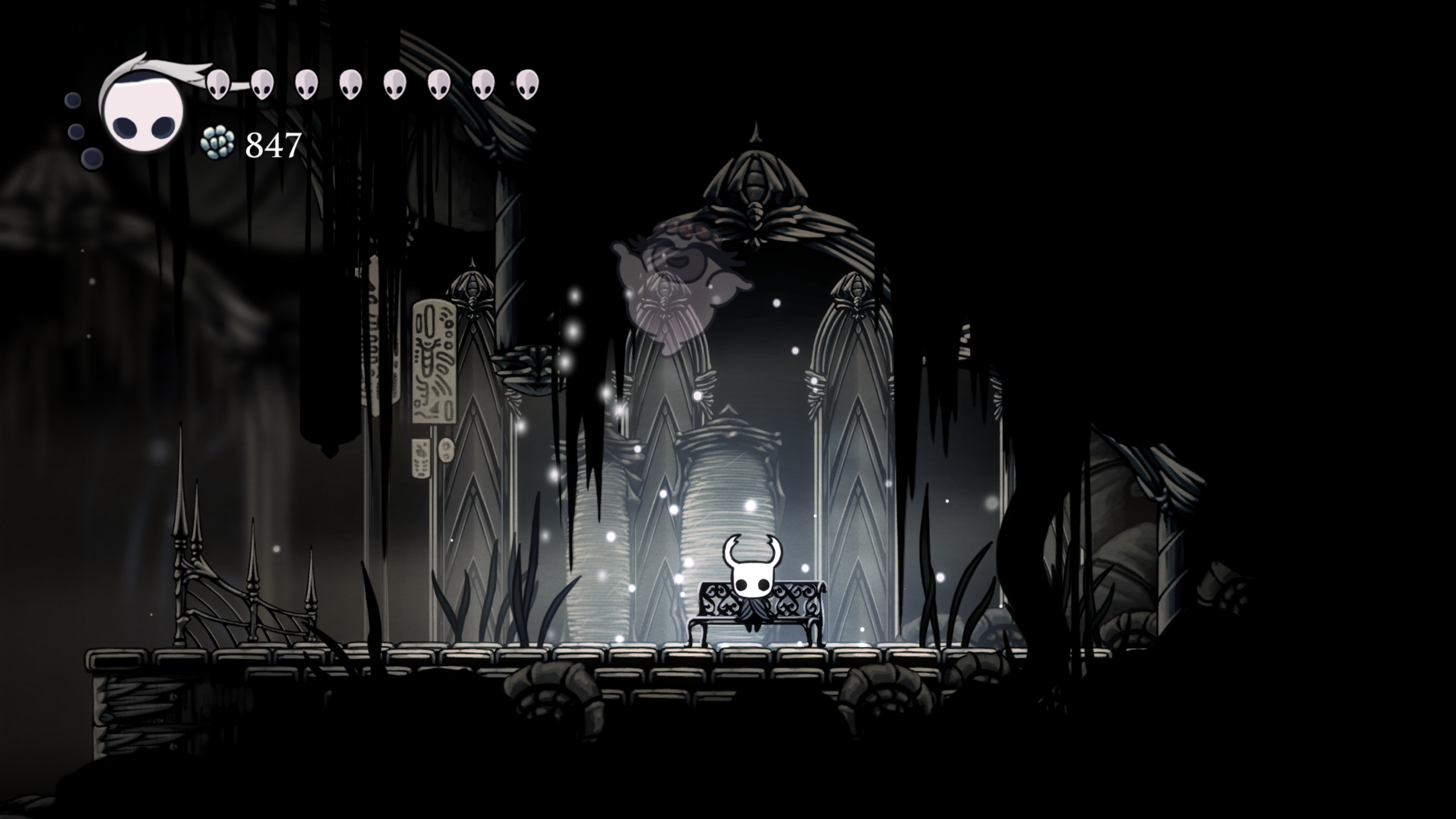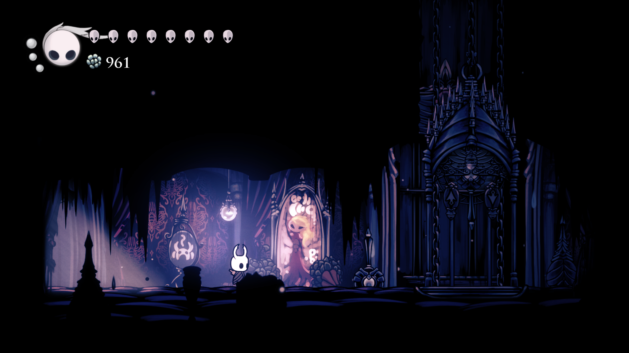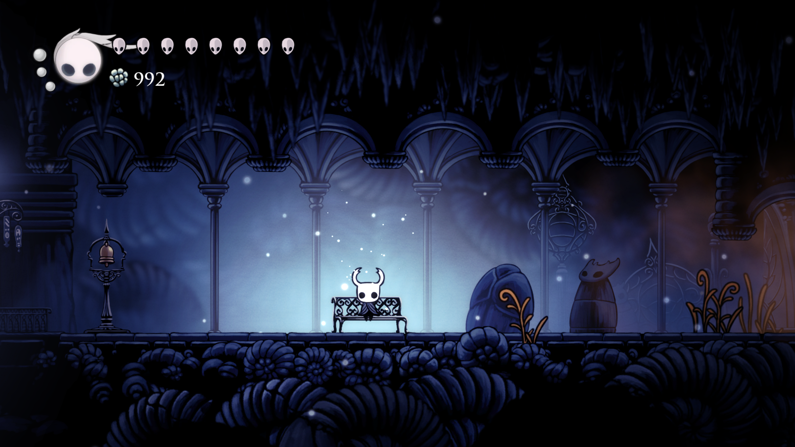 Si bien HK brilla en elementos individuales como los que ya mencionamos, no deja de lado la coherencia del mundo, cada sección del mapa tiene sentido, tanto en su ubicación como en su diseño e historia en general y se te hace notar a veces en detalles muy sutiles. Uno que muy recientemente me percaté es en una “fuente de los deseos” donde te pide tirar Geo (la moneda del juego) aparentemente para nada, ya que el diálogo algo críptico te hace creer que solo lo vas a tirar en vano, pero si observas bien la fuente te darás cuenta que es lo que obtendrás a cambio. Otro detalle es en el pueblo de las mantis, que dentro del juego son una tribu de guerreras con gran orgullo y si te adentras a lo mas profundo de su zona, te topas con una entrada a Deepnest, pero el escenario te muestra como las mantis han estado manteniendo a raya las criaturas que viven ahí abajo. Un mundo tan lleno de detalle que es muy complicado darse cuenta de todo por uno mismo, pero cada que lo juegas y notas algo nuevo, el mundo te vuelve a cautivar como la primera vez.